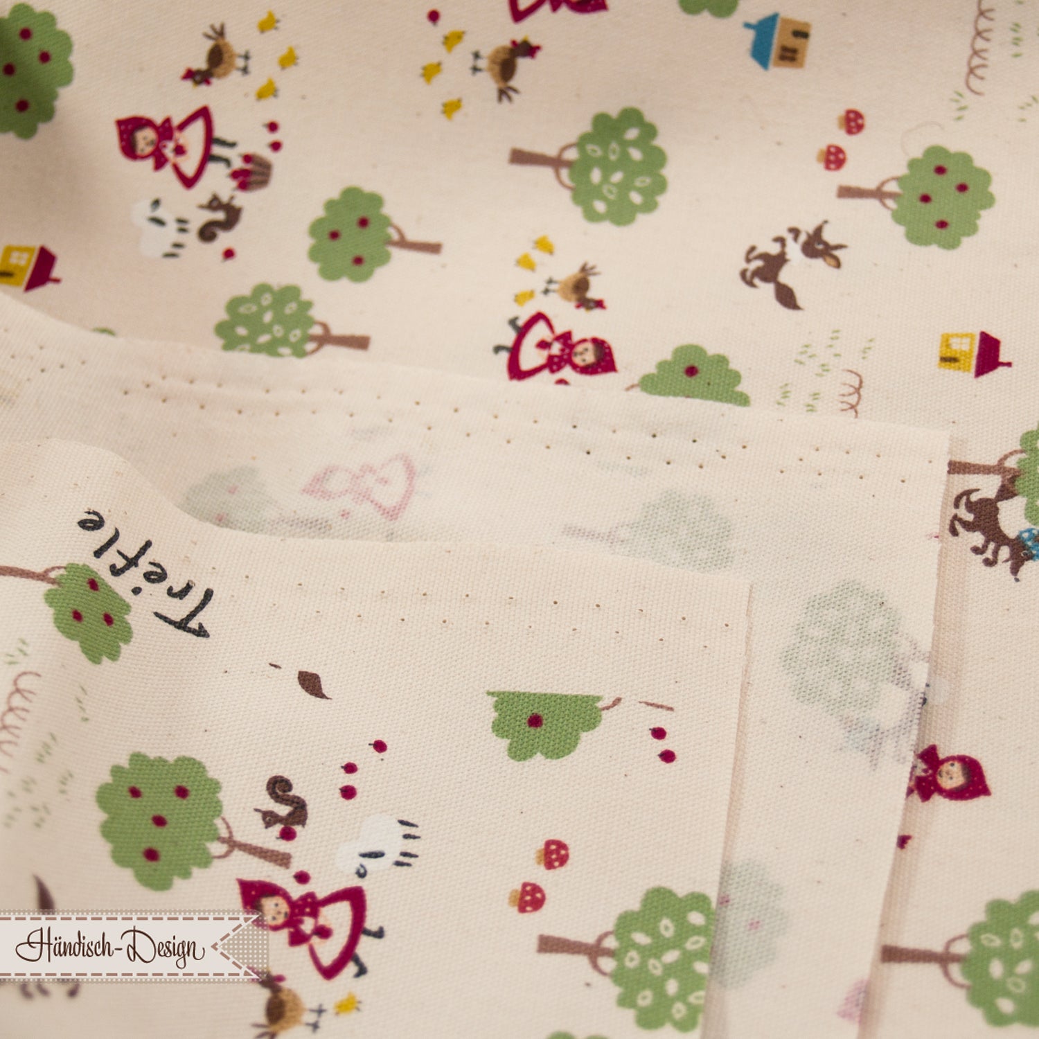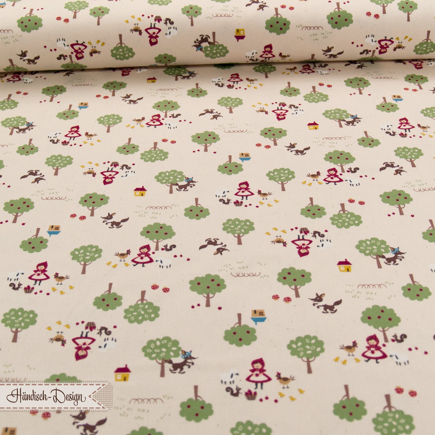 Strukturierter eher fester Baumwoll-Oxford-Stoff „der Wolf und das Mädchen – Chibi-Pri“ mit Bäumen, Mädchen und Tieren von kokka. Oxford ist etwas zarter als der dickere und gröbere Canvas.