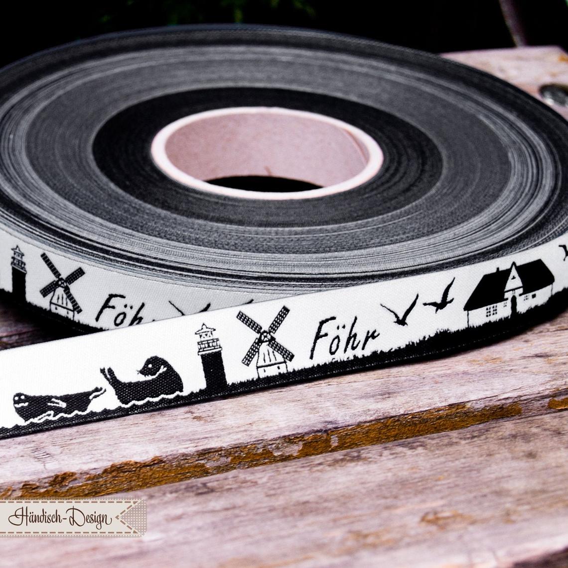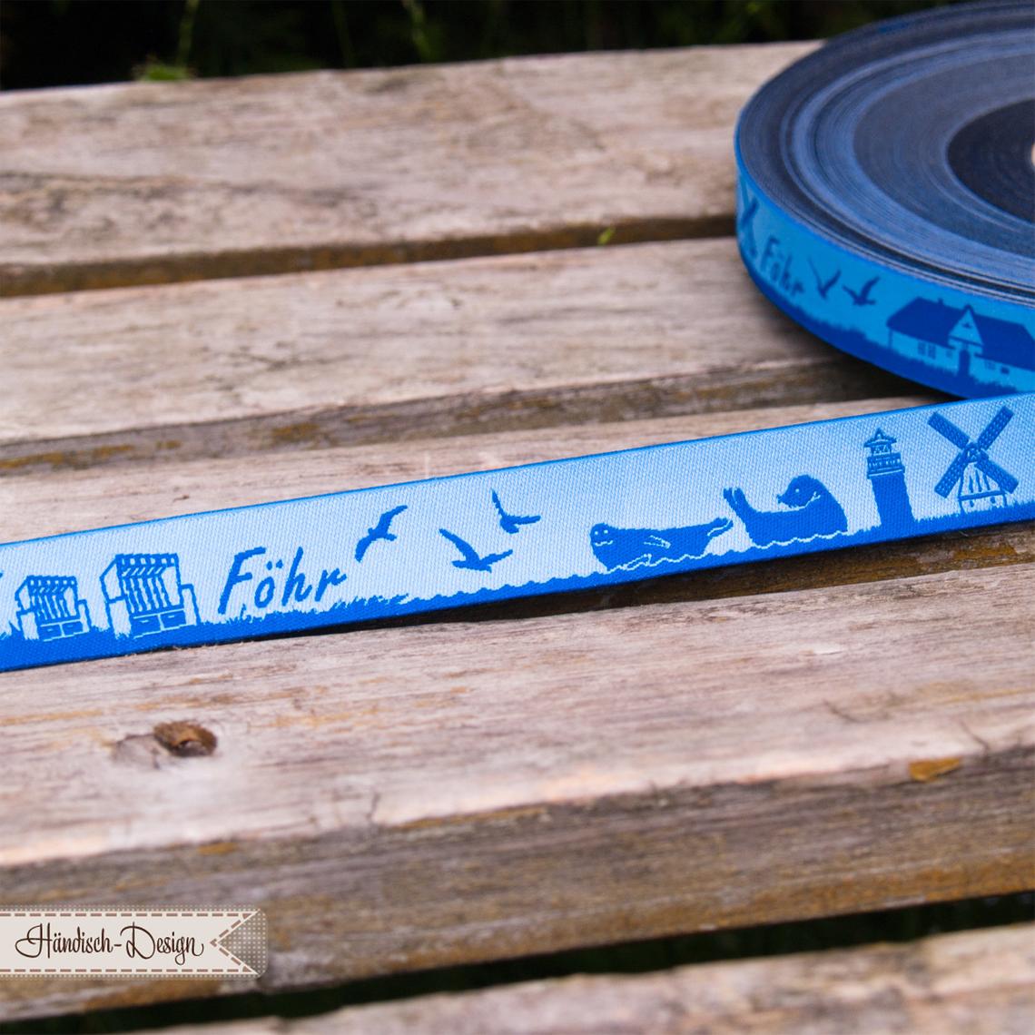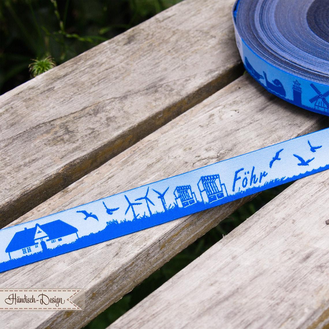 Die Insel Föhr, auch "Friesische Karibik" genannt zeigt auf dem Band Möwen, Seehunde, Strandkörbe, Windräder und eine der historischen alten Windmühlen: die Wrixumer Mühle (Osterwindmühle) sowie das Haus Olesen und den Leuchtturm Ohlhörn.