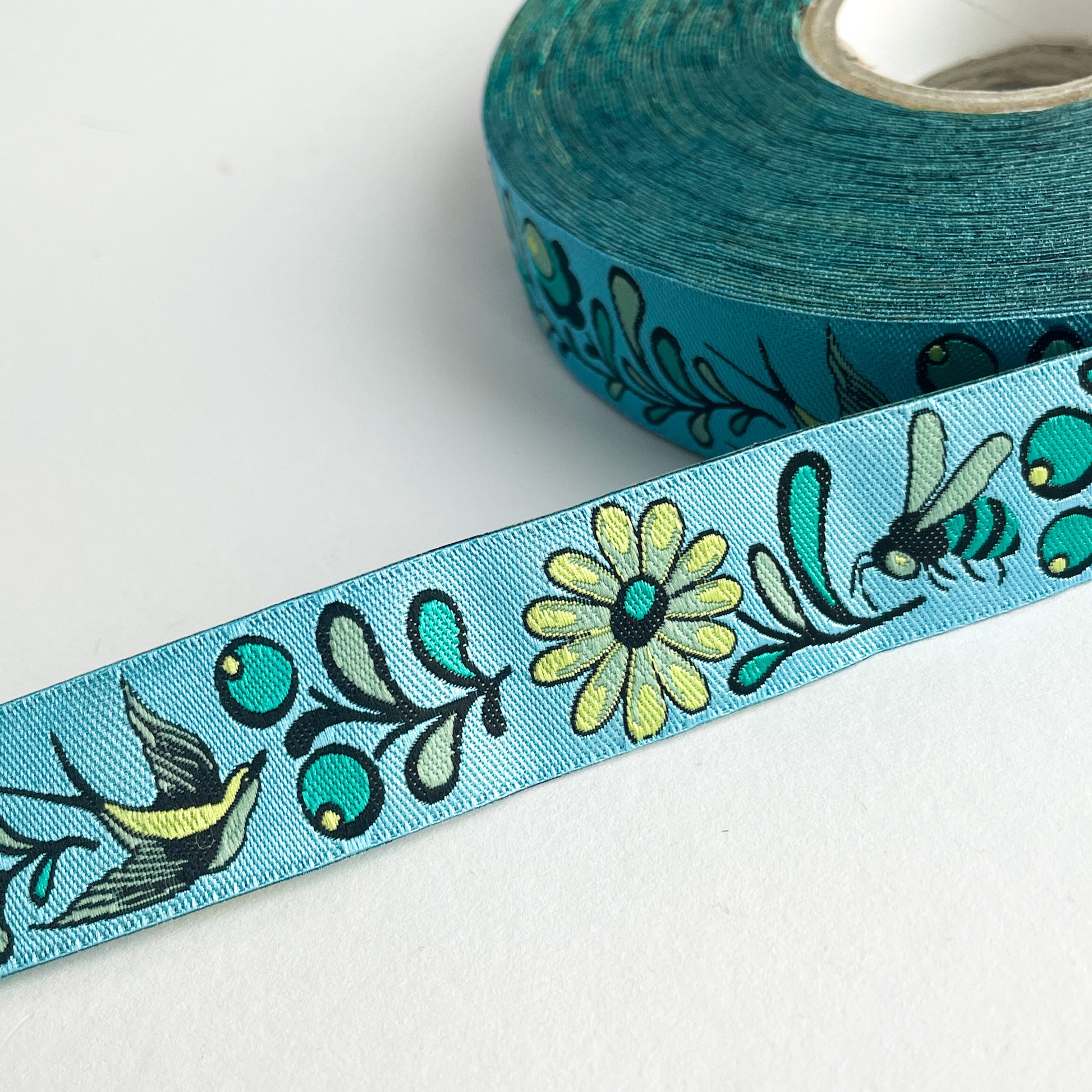 Hellblaues Webband mit Schwalben, Bienen und Blumen.