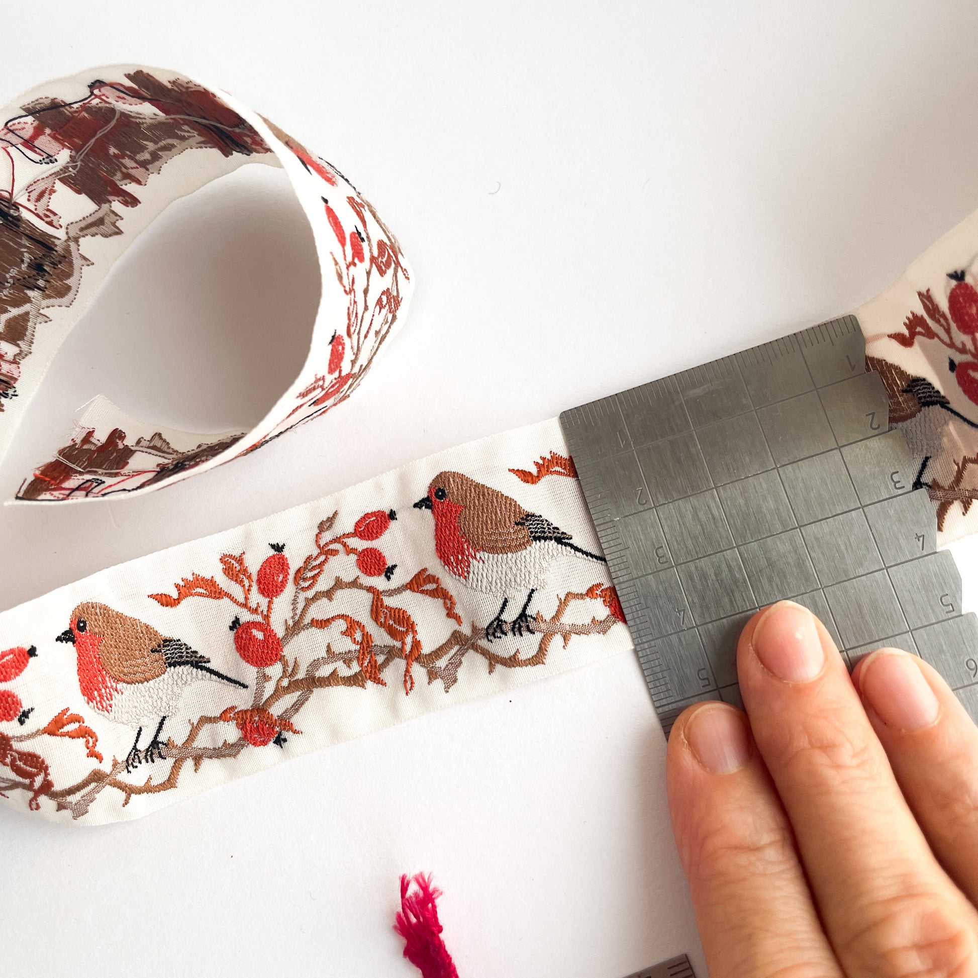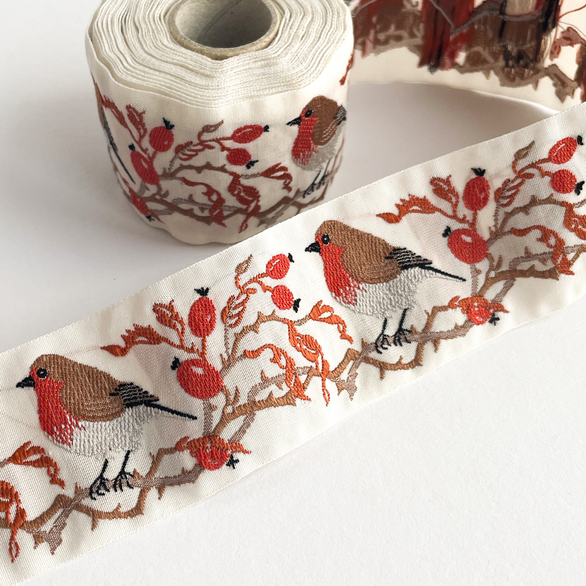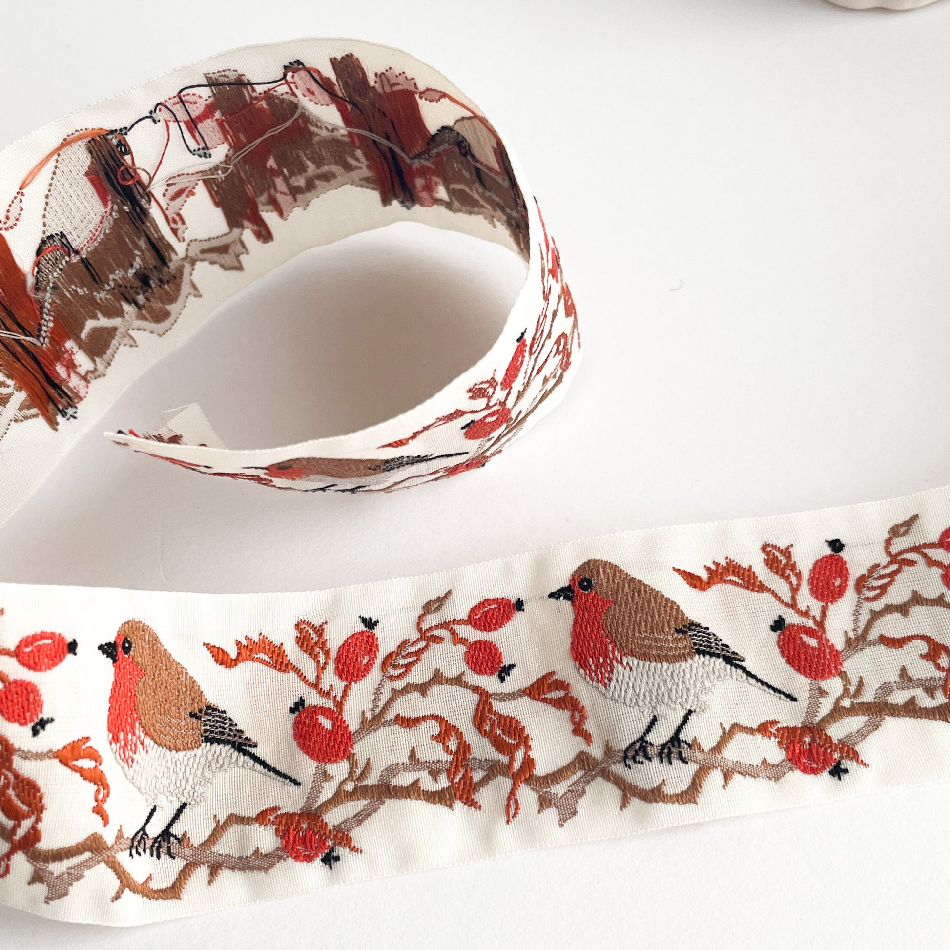 Jacquard-Webband mit leicht dreidimensionalem, herbstlichem Muster mit Rotkehlchen und Hagebutten.