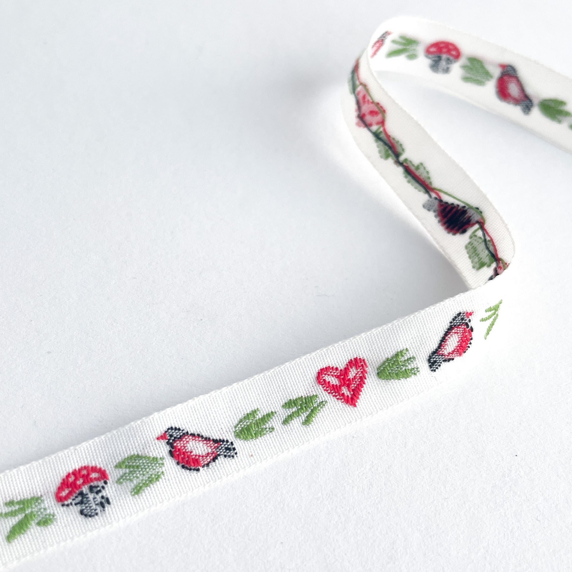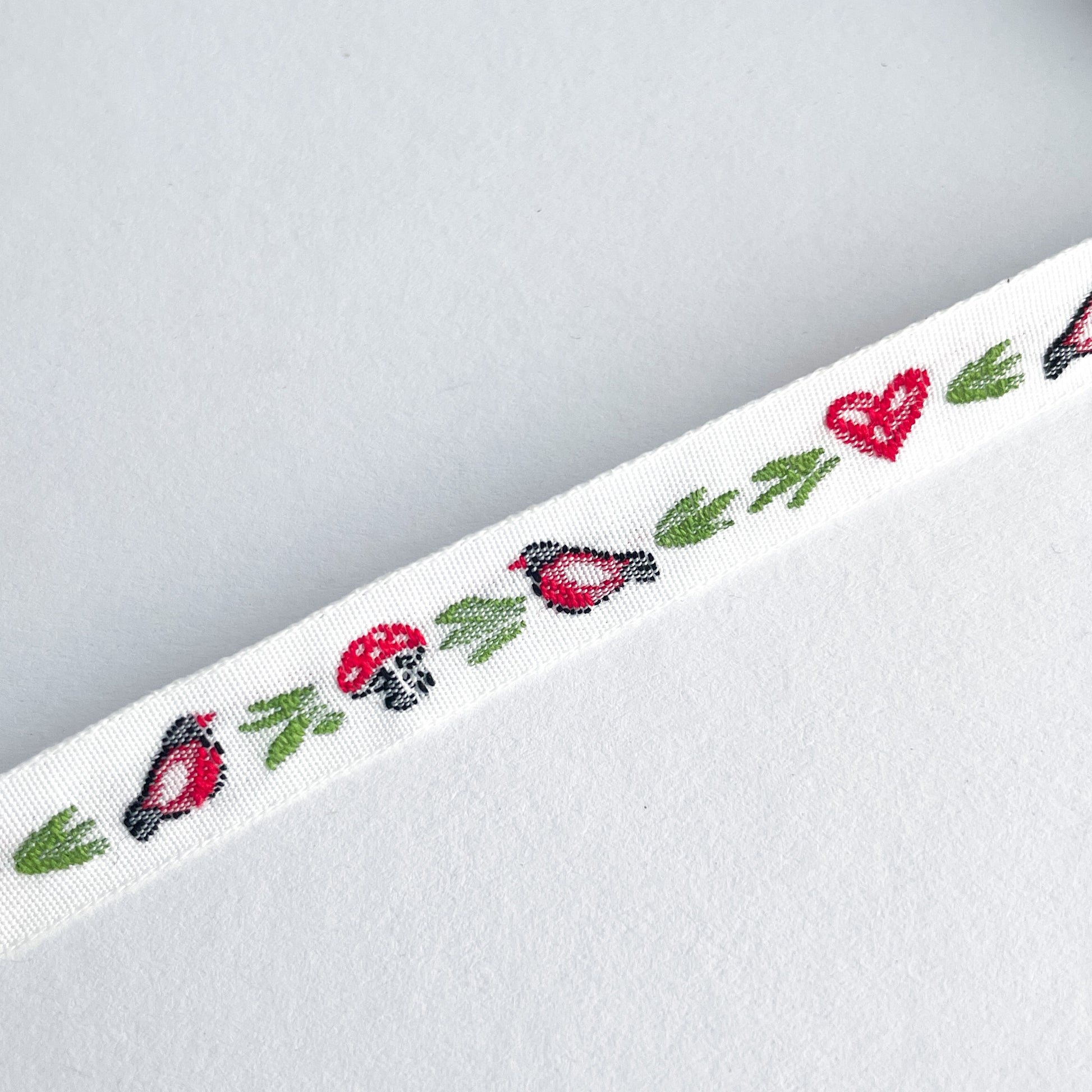 Schmales Webband mit kleinen Vögeln, Herzen und Fliegenpilzen.